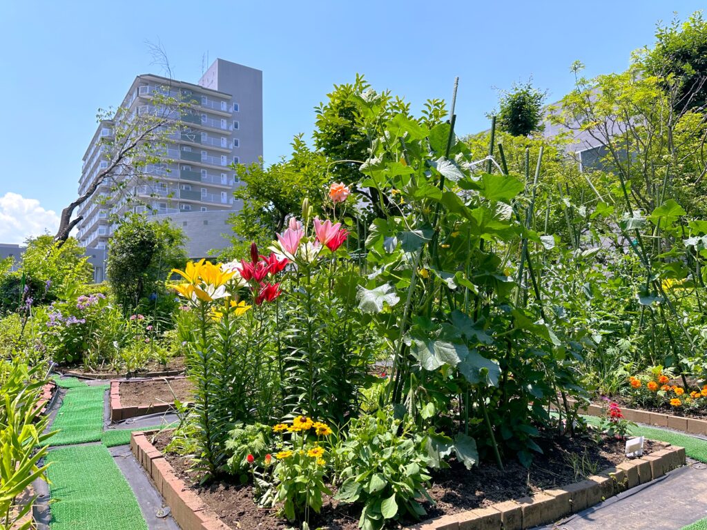 春にはお花が咲き乱れ、夏にはキュウリやトマト等がたくさん実ります。